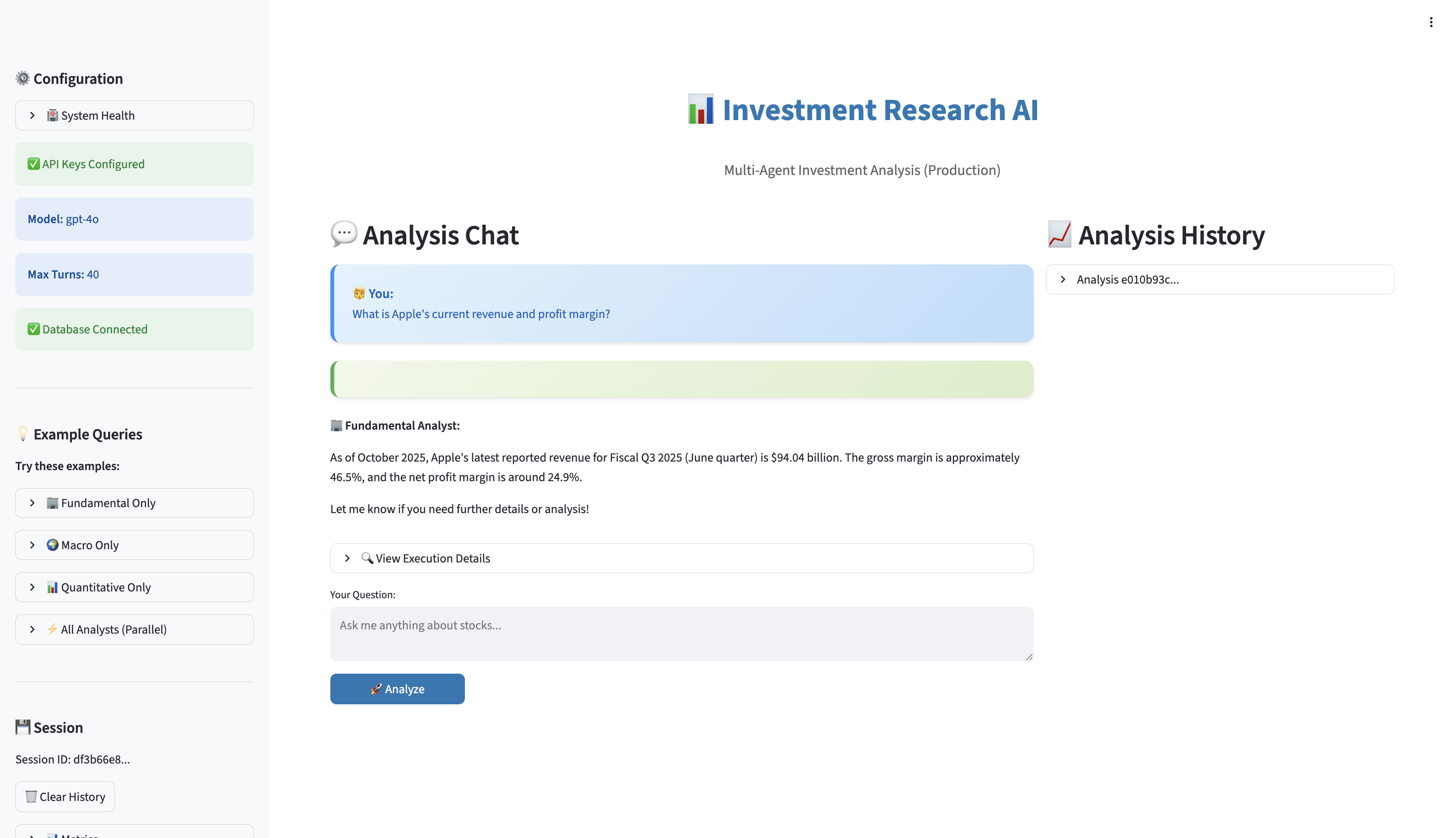 investment-agents/ ├── research_agents/ │ ├── portfolio_manager.py │ ├── fundamental_analyst.py │ ├── macro_analyst.py │ └── quantitative_analyst.py ├── tools/ │ ├── fred_api.py │ └── memo_editor.py ├── prompts/ │ └── *.md (agent instructions) ├── database/ │ ├── models.py │ └── memory.py ├── streamlit_app/ │ └── app.py └── main.py